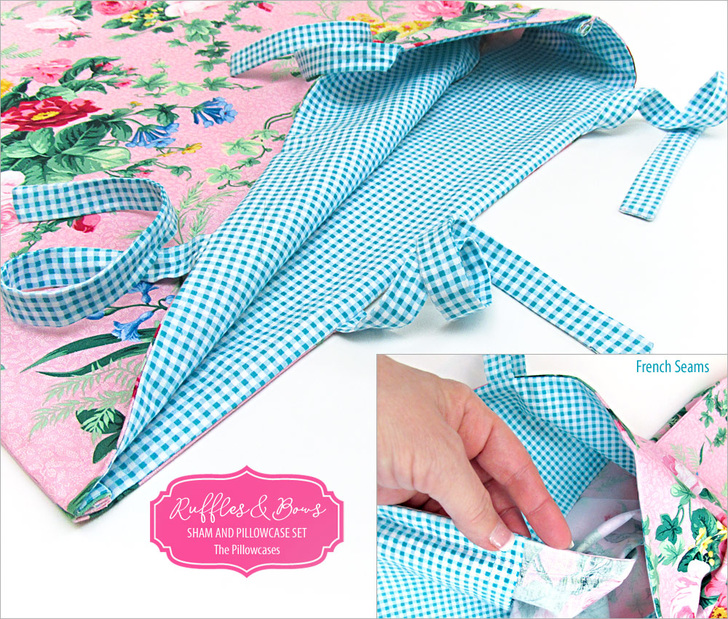 We used the same gingham fabric featured on the coordinating shams for the ties as well as for the wide facing. The ends of the case are visible between the bows, so this construction technique creates a beautiful finish and the happy gingham fabric peeks out for an extra pop of color.