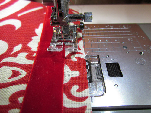 - Stitch across the end. Sew with the ribbon-trimmed side facing up, so you can see the previous ribbon stitching lines. The new stitching line should be ⅛” to the right of the previous ribbon stitching to ensure the ribbon is not caught in the seam. This means it will be just ⅛” narrower than a traditional ½” seam allowance.