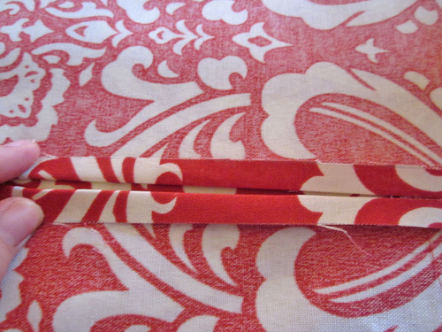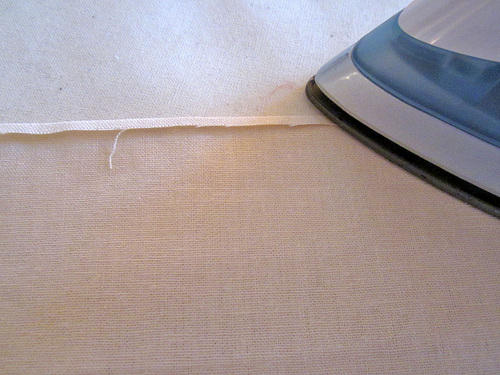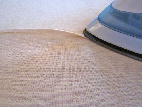 - Make a narrow hem along one 27″ side of each rectangle. To do this, fold under the raw edge ⅛” and press well.