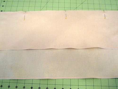 NOTE: Some heavier fabrics may require a little bit wider hem, but the beautiful washer linen we chose allows for a very tiny hem. - Place the two wider ruffle strips right side up and flat on your work surface. Place a narrow ruffle strip on top of each wide ruffle strip, also right side up. Align the top raw edges and hemmed side edges. Pin in place along the top edges of each pair.