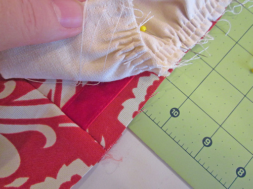 - Pull the basting threads of one double ruffle so it matches the width of the sewn table runner.