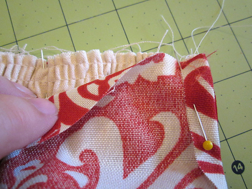 - At each side, fold the seam allowances back so they wrap the end of the ruffle.