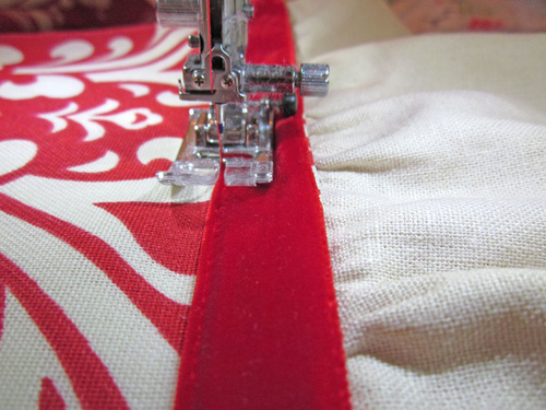 - Then stitch across each end, running the seam just to the inside (just to the left) of the velvet ribbon.