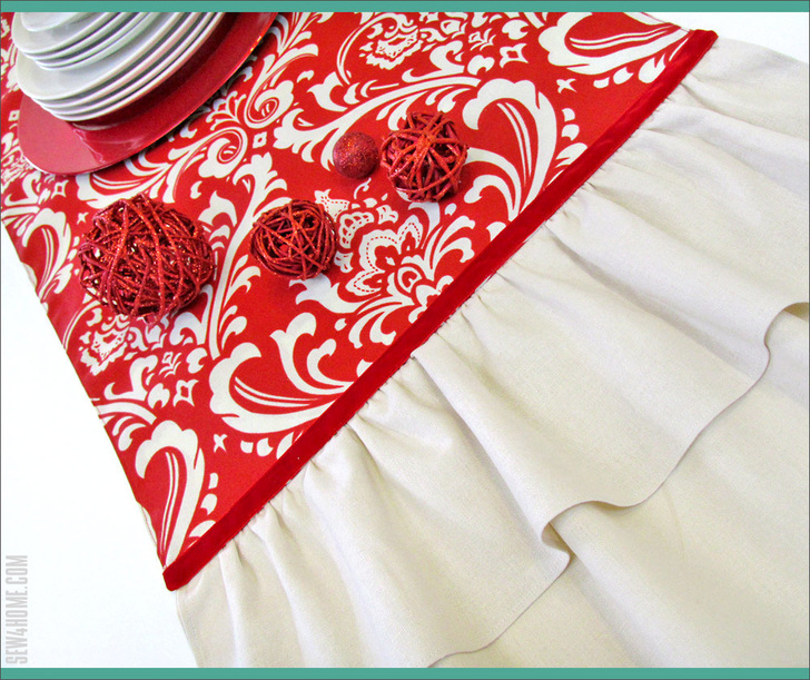 To figure the correct length to fit your table and the yardage needed, measure the table then add 6″ – 8″ for a 3″ – 4″ drop at each end; the ruffles will add another 10″ to each drop. Our table was 64″ in length. To that we added 8″ for a 4″ drop on each end for a length of 72″ total. The seam allowances will take up a minimal amount so don’t stress about that in your figuring.