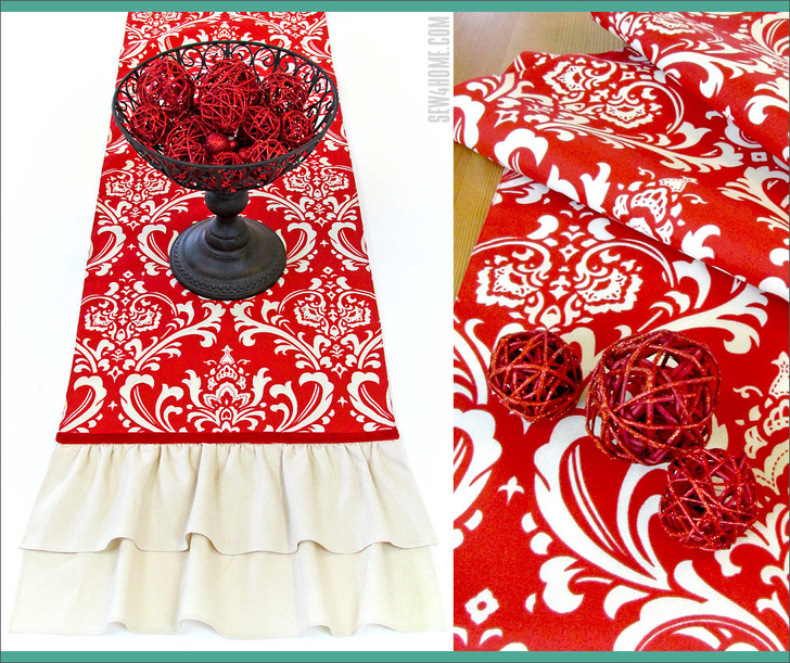 When browsing for great fabric for a seasonal table runner, we often find ourselves in the home décor category because of the bold designs and striking colors you can find there. These traditionally heavier fabrics are where most people turn for larger projects, such as curtain panels or upholstered items, because the motifs tend to be bigger and the tones more dramatic. Not only is it beautiful fabric, it’s also often thicker, tougher, and more durable. Batting is usually necessary with runners made of standard quilting weight cottons in order to protect the tabletop from hot or wet dishes. But with this fabric, two simple layers provide plenty of protection… unless, of course, you plan on serving sizzling fajitas at the table for your holiday dinner!
