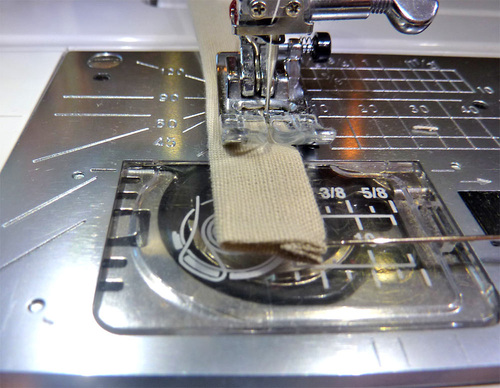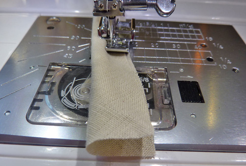 - Stitch the length of the strip, staying as close to the cording as the foot will allow. If possible on your machine, you can move your needle position to the left to snug up your seam line even closer.