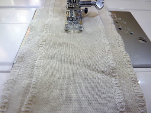 NOTE: On our Janome, we adjusted our stitch for a tighter appearance, reducing the height to 4.5mm and the width to 1.8mm. - Overcast both long sides of all 10 strips.