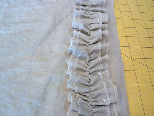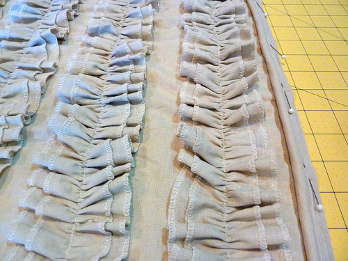 - Stitch each ruffle strip in place, running your seam directly on top of the original gathering stitch, removing the pins as you go.