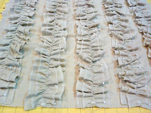 - Pin the ruffle strips in place so one is centered along each 2″ and 4″ line.