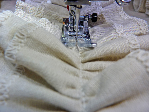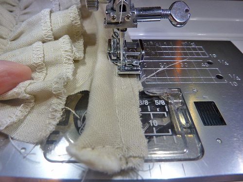 - Run a gathering stitch up the center of each set through both layers. A gathering stitch is your standard straight stitch set to its maximum length and without any stitch locking at the beginning or end of the seam. Leave the thread tails long at both ends.