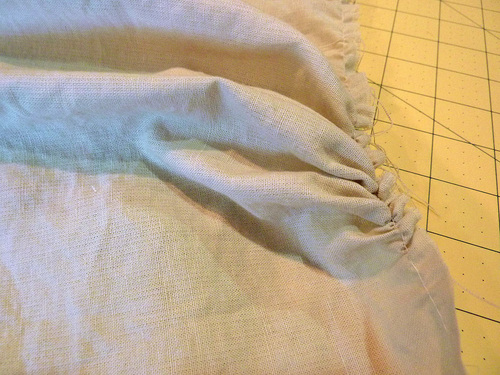 - Pull the tails of the gathering stitches to create the ruffle. Pull until the length of each strip is 21″, matching the width of the base panel.