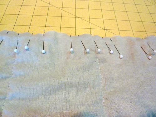 NOTE: Straight placement of the ruffle is very important. Start by lining up the bottom edge of the ruffle strip with the bottom edge of the base panel. The center gathering stitch should be right on top of the marked line. Gently adjust the gathering as needed so it is even. Place a pin about every 1½” – 2” through all the layers all along each strip. You will have quite a few pins, but it will keep the center of the ruffle right on top of the marked line.