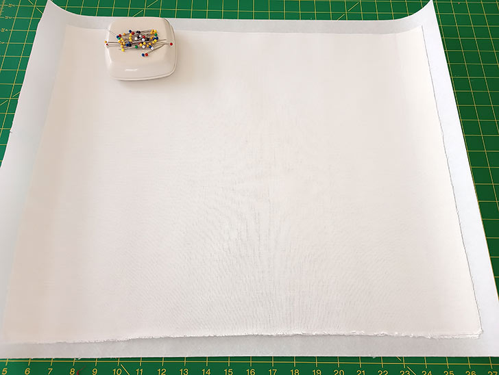 - Stack both linen panels on top of the stabilizer panel. The linen panels should be wrong sides together, and the raw edges of the two panels should be flush on all sides. Center the linen so there is 1” of stabilizer extending beyond the linen on all sides.