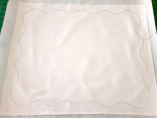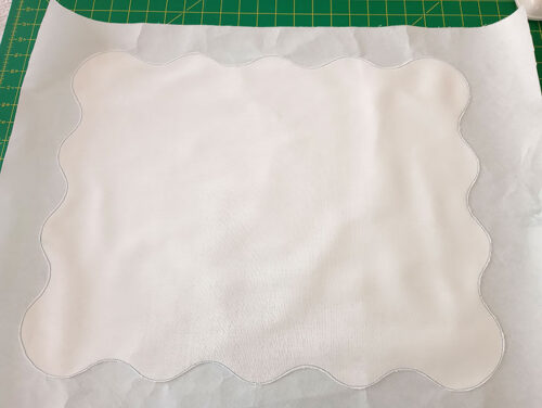 - Stitch around the entire perimeter with a line of standard straight stitching. You are sewing along, but not on, the scalloped edge of the paper pattern. So, you are sewing through just three layers: the stabilizer and the two linen panels; you are tracing the edge of the pattern with your stitching rather than with a pen. Overlap your start and end points about ¼”.
