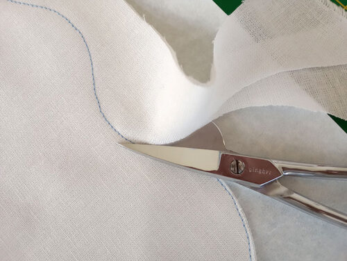 - Trim away the excess fabric close to the stitching line. Any small, sharp scissors can work, but a pair of duck bill appliqué scissors makes things much easier. This type of scissor has a wide blade on one side that helps protect your underlying layer. Place the wide blade between the linen fabric and the stabilizer and trim the fabric, leaving the stabilizer intact. These specialty scissors really help!