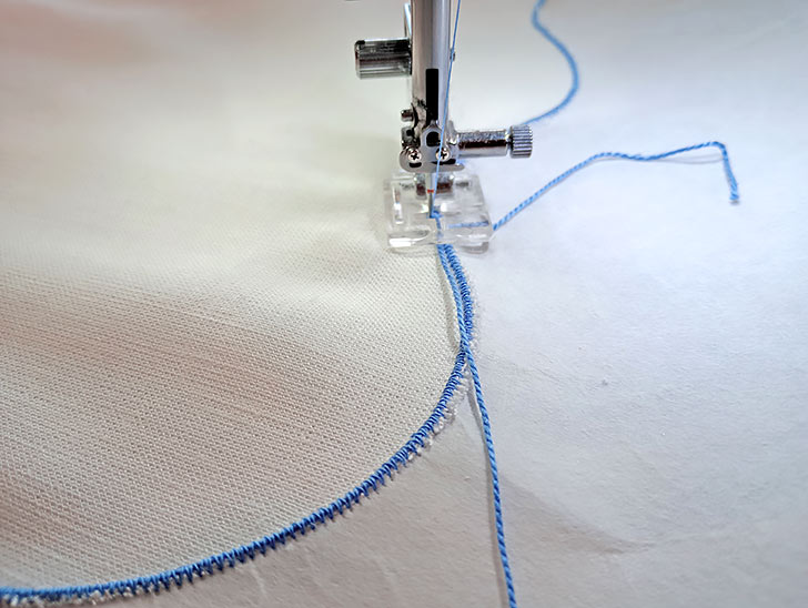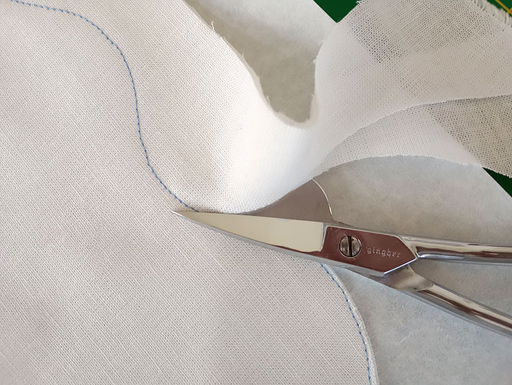 Speaking of stabilizer, that’s an important part of the technique. You’ll pick a wash-away option and cut it to extend beyond the scallops. After your three rounds of stitching, you’ll remove the excess stabilizer to reveal your pretty finished edge.