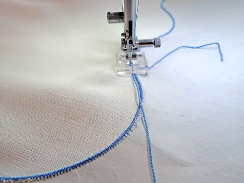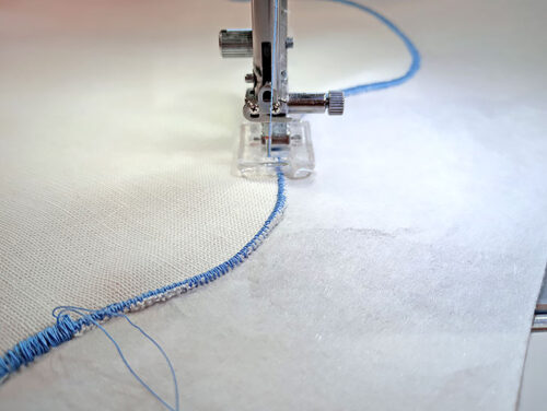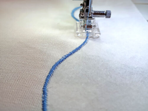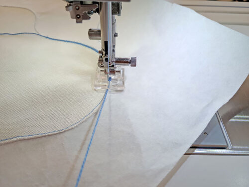- Place the linen panel under the foot. You should start and end as the same point as your original perimeter stitch line.