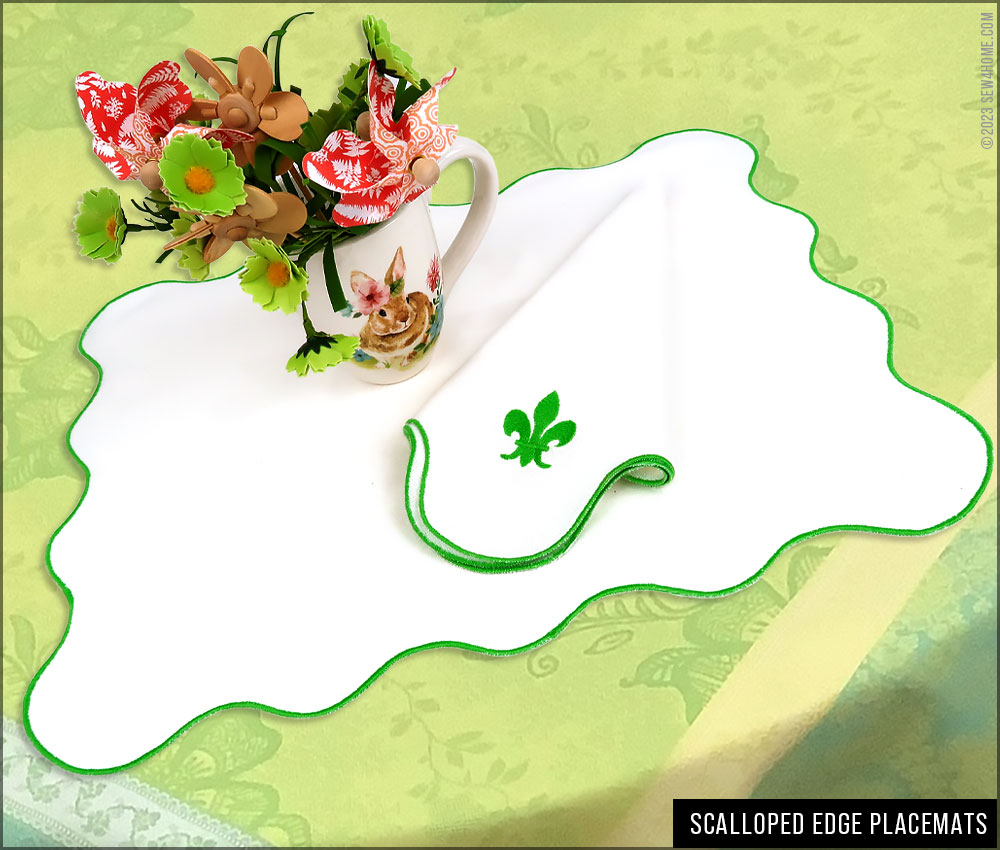 Our Scalloped Edge Placemats finish at approximately 20” x 16”. And, don’t forget to check out the matching Scalloped Edge Napkins.