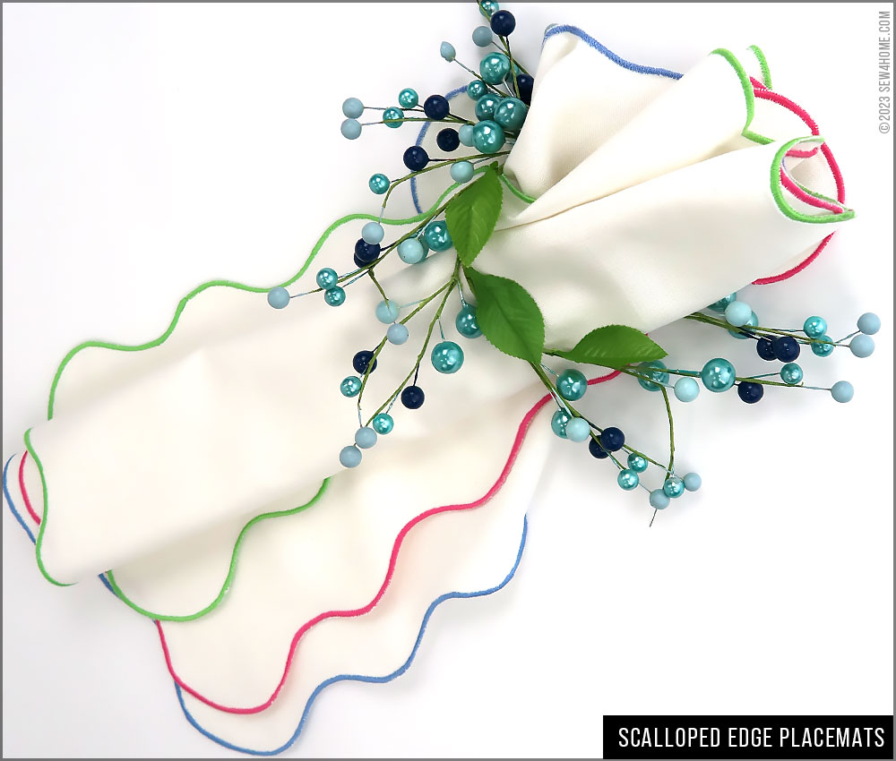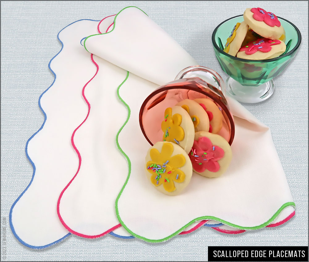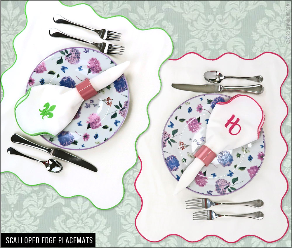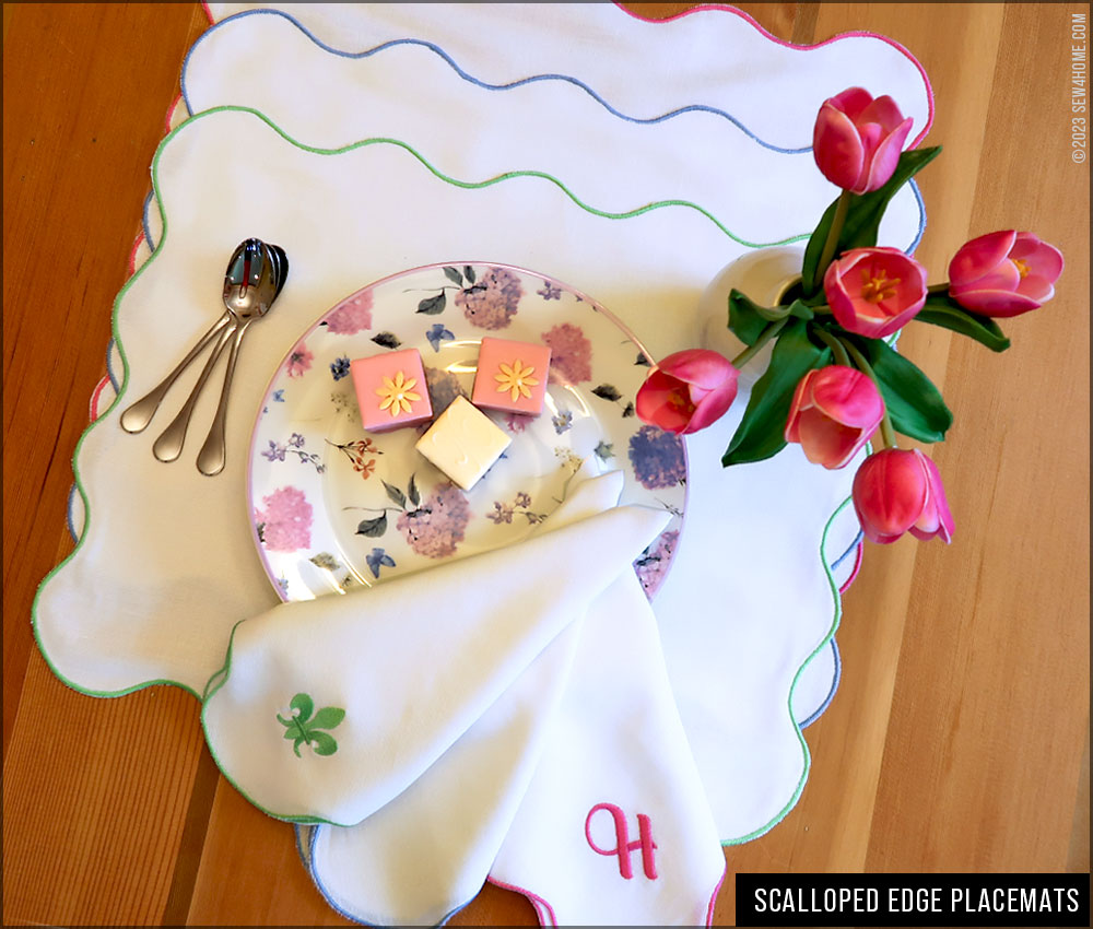 We love the simplicity of just the edge finishing. However, you could add a little extra flair with embroidery. If you have an embroidery machine in your sewing space, click through to the companion Scalloped Edge Napkins tutorial to find free downloads for the bold alphabet as well as for the fleur de lis art we used on our napkin samples. You’ll find six different machine embroidery formats from which to choose.