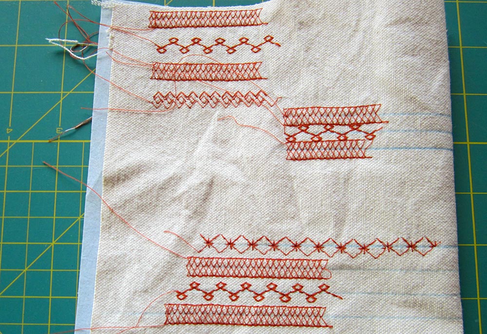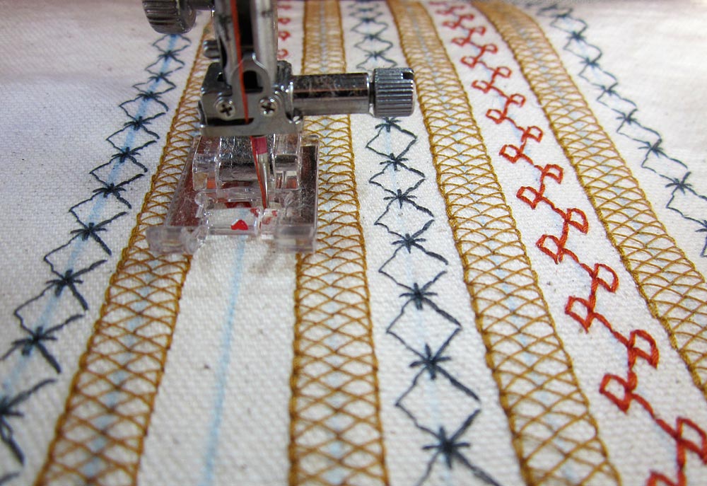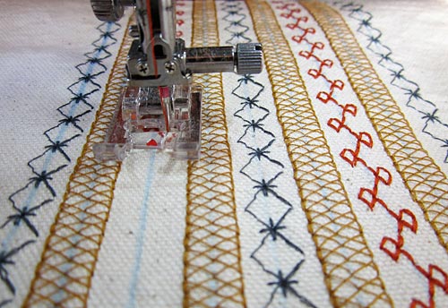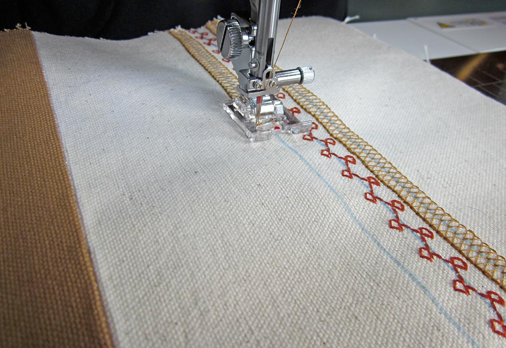 As shown below, it’s important to test your decorative stitches to find and place the options you like best. Take the time to do practice stitching on scraps of your actual fabric to get the spacing and repetition just right. You want variety, but don’t go overboard or the effect can become overwhelming. We recommend just three stitch patterns and three complimentary colors.