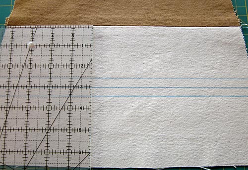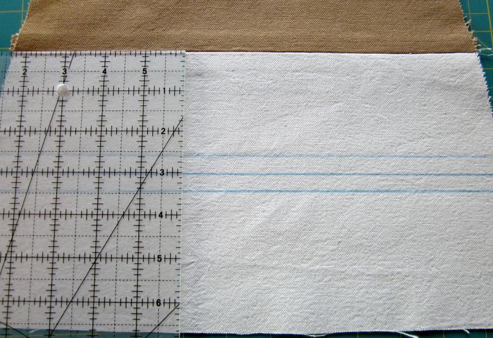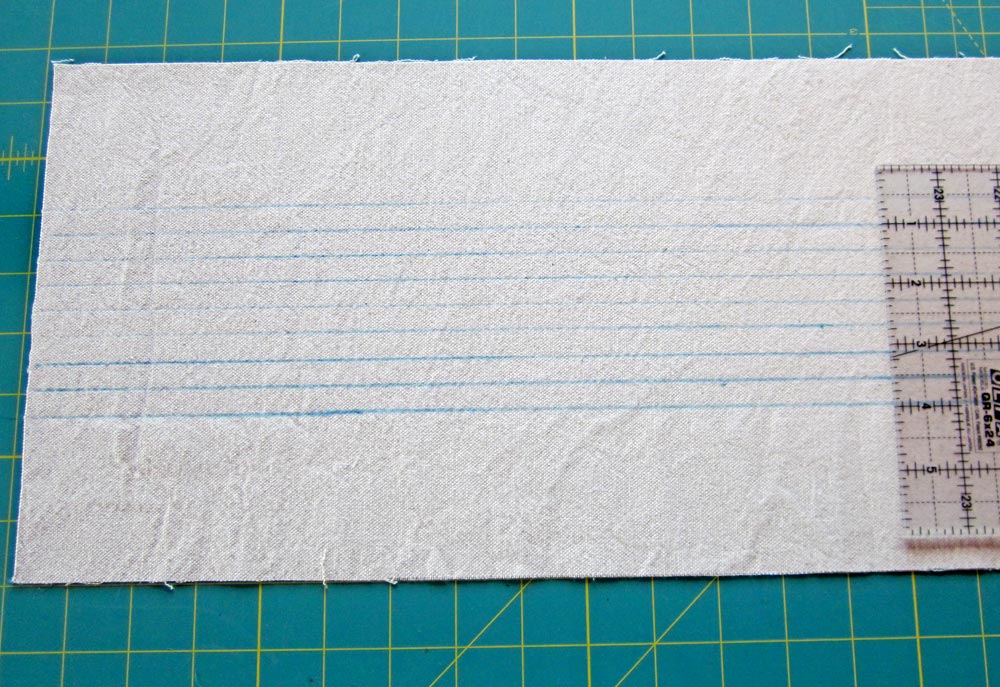 - The pocket panel requires NINE guides lines. First find the center point (top to bottom) of the pocket panel. You can fold the piece lengthwise to find or center or measure 4½” from the top raw edge. Draw this line first, horizontally across the entire piece. Then, draw FOUR parallel lines above the center line, each ⅜” apart, and FOUR parallel lines below the center line, also each ⅜” apart (or whatever spacing your tests determined).
