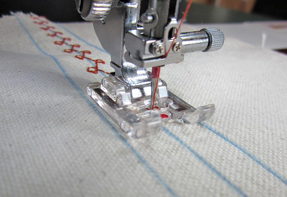 NOTE: Because the back of all our decorative stitching is hidden, you can use white bobbin thread with all the top thread colors to speed up the thread changes. Just make sure your tension is correctly set so none of the bobbin threads pull up to the top. This is part of the stitch testing steps above. - We started with the decorative stitching on the apron bib. First stitch the center row.