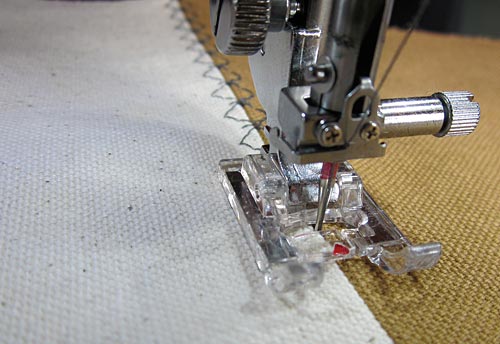 - Re-thread again and stitch the row that bridges the seam between the two fabric colors of the bib. Use the seam itself as your center guide.