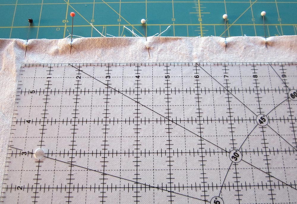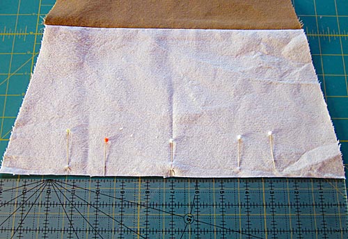 - With the skirt and pocket panel still flat and smooth, find the exact center. The easiest way is to fold in half and mark with a pin at the center fold. If you don’t want to disturb your nice flat layers, measure 14″ in from one raw side edge.