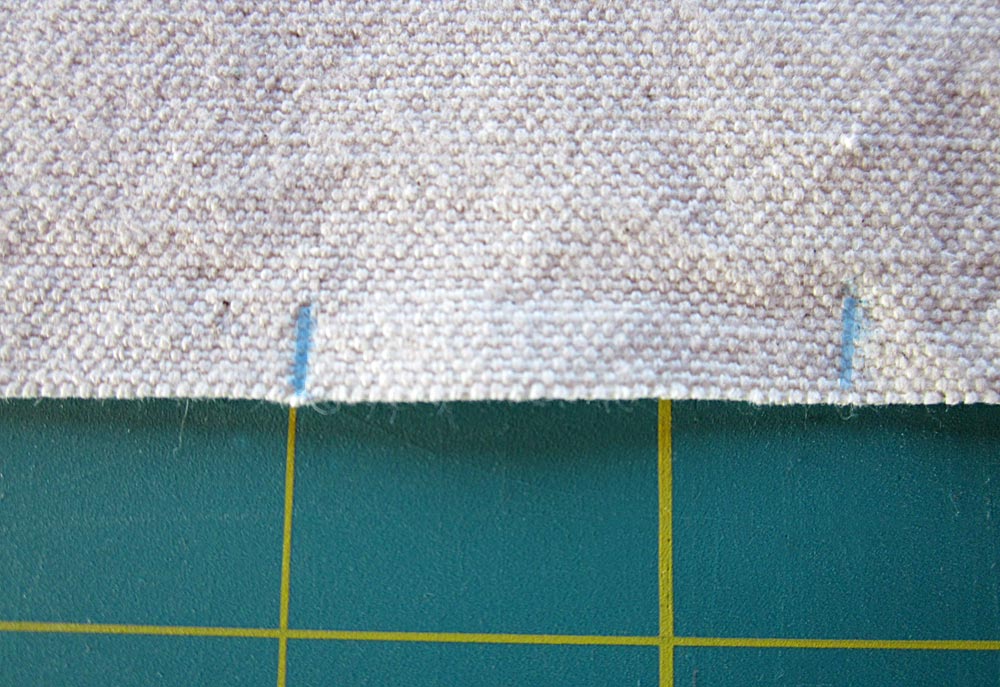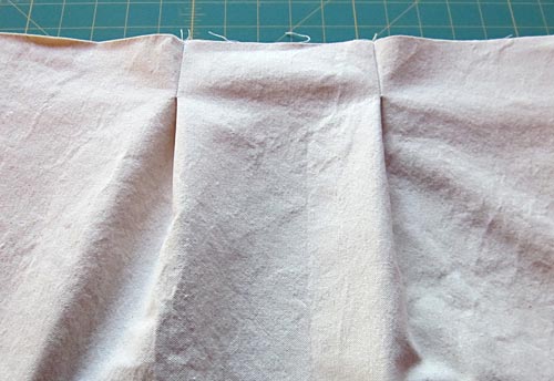 - Run one line of stitching along these measurements to hold each pleat in place: ¾” from the pleat fold and 2″ from the bottom raw edge to the end of the seam.
