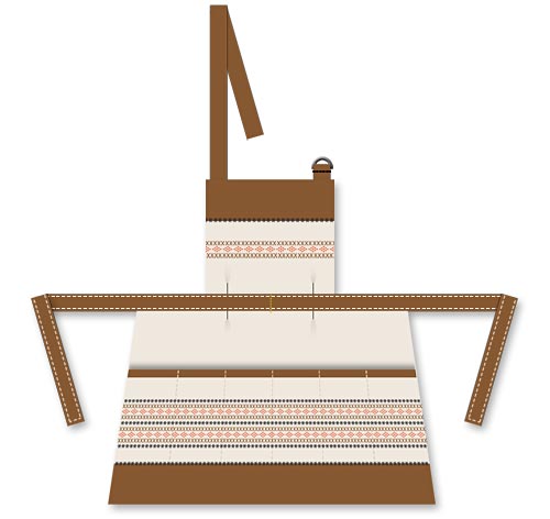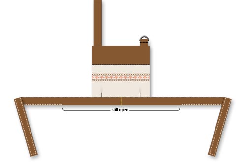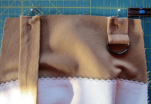 - Fold the short tab in half so the raw ends match up. Slip the two D-rings into the fold.