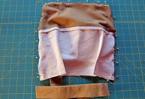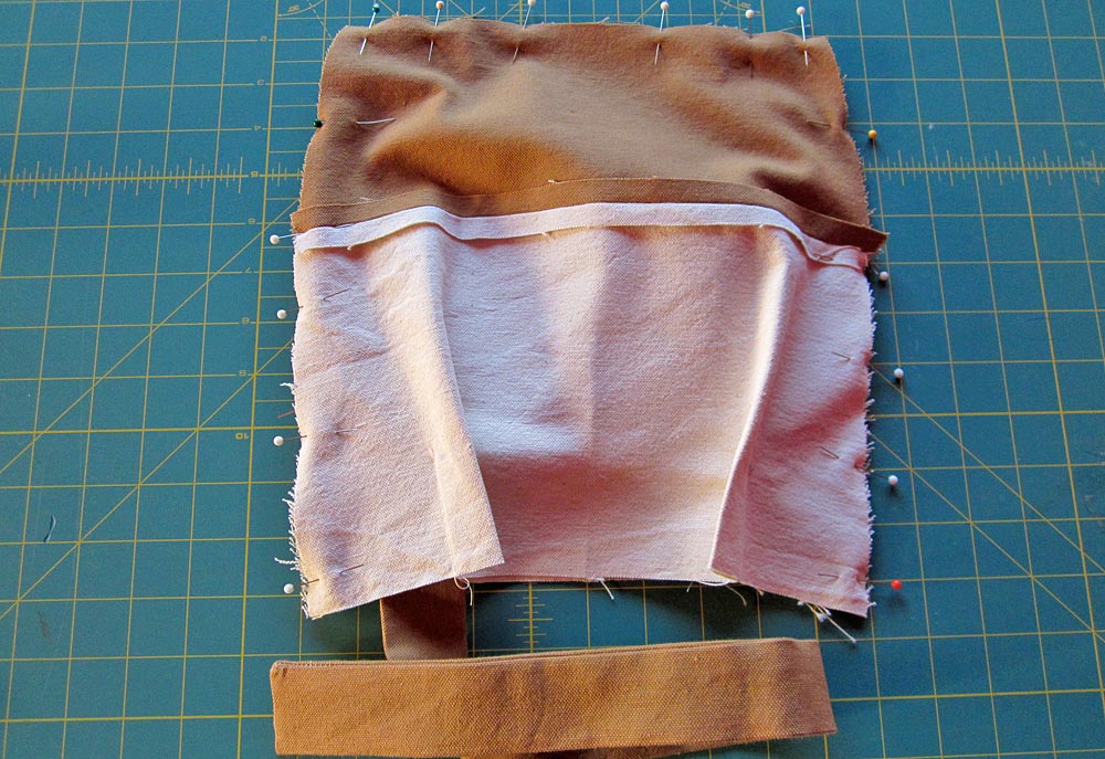 - Insert the bib into the top opening (the 10″ opening) of the waistband. Pin in place.