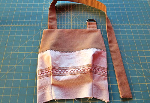 - Pin the folded and stitched tab 1″ in from the right side of the bib. The raw edges of the tie and the top raw edge of bib should be aligned; the folded end of the tie with the D-rings should be hanging down.