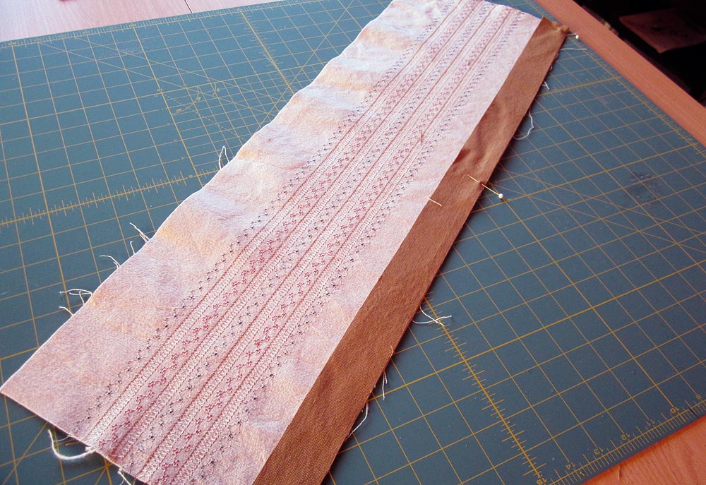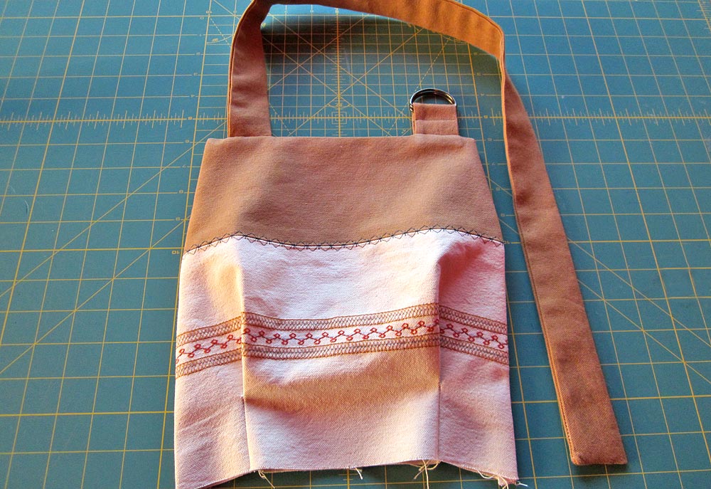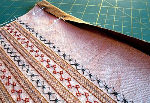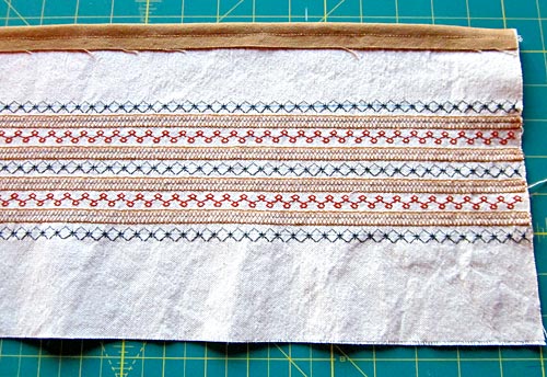 - Set up your machine again for decorative stitching, and, as you did above on the apron bib, run a final decorative stitch across the pocket/border seam. Use the same decorative stitch that you did for the bib crossover stitch.