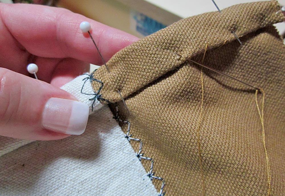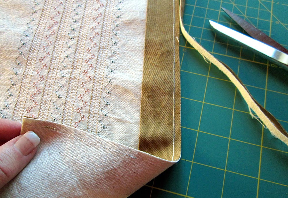 - There are a LOT of layers along these side hems. With all this bulk, we recommend you hand stitch the hems in place. We stitched with two different colors of thread – nutmeg along the border and then natural along the rest of the skirt.