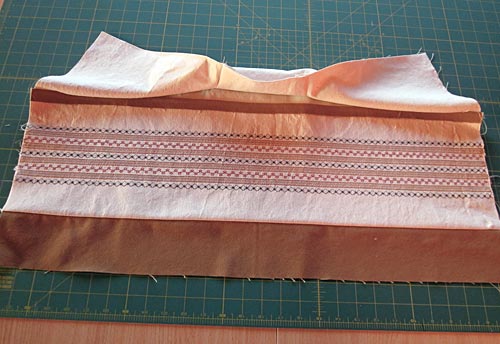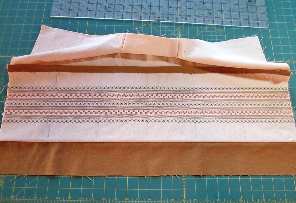 - Fold up both the pocket panel and the skirt, encasing the finished seam at the inside bottom of the pocket. The skirt is now facing right side up, the pocket panel is also facing right side up and the bottom border strip is sticking out the bottom.