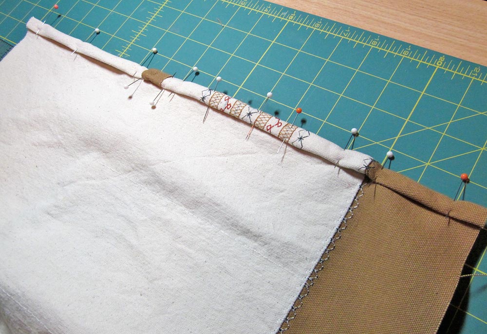 - Insert the skirt into the bottom opening (the 24″ opening) of the waistband. Pin in place. Line up the pleats of the bib with the pleats of the skirt.