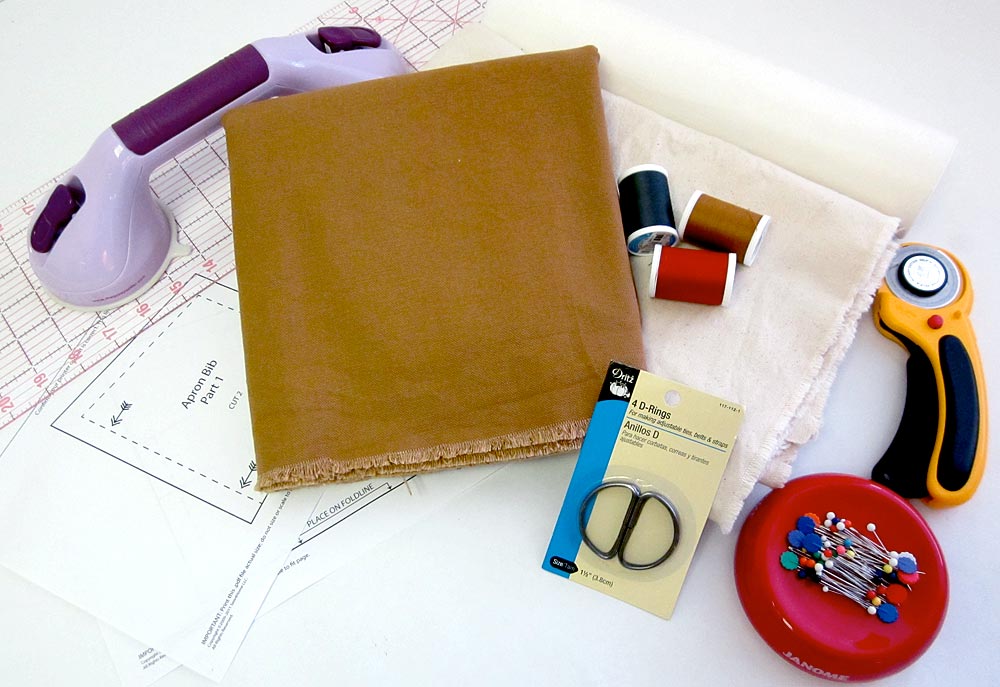 - ¾ yard of 45″+ wide mid to heavyweight accent fabric for apron upper bib, waist and neck ties, and bottom border; we used a 54″ cotton duck in Nutmeg