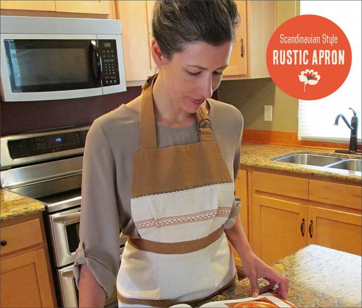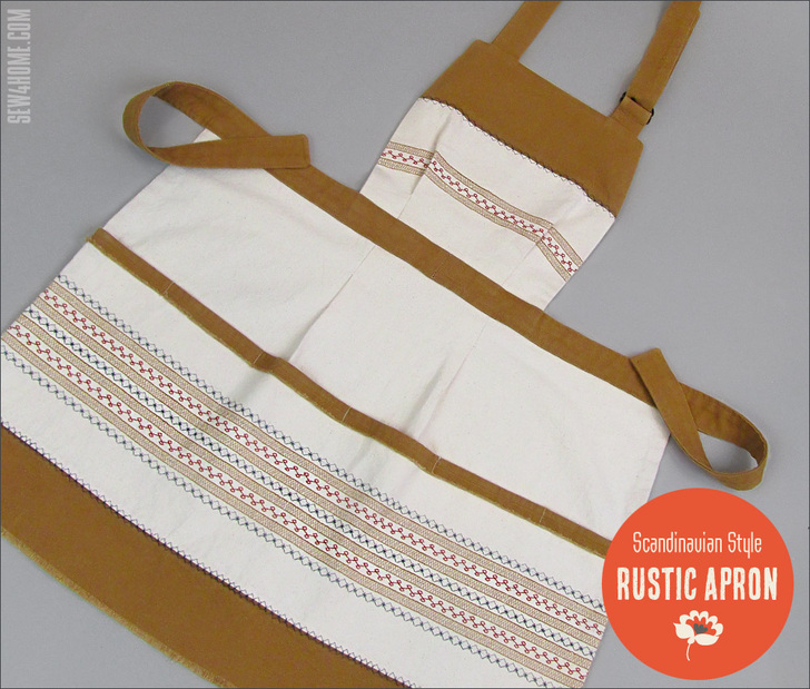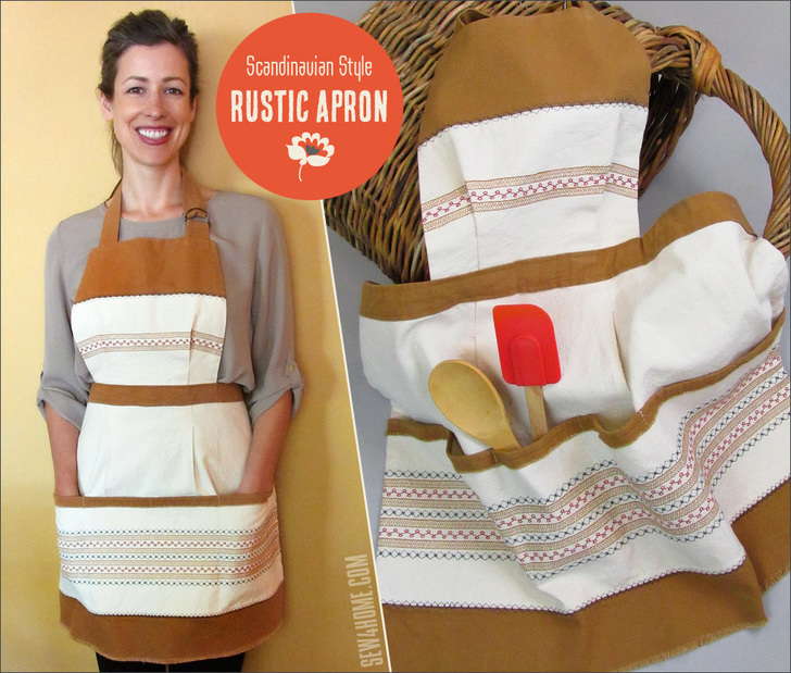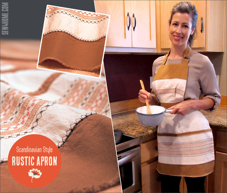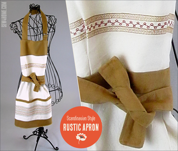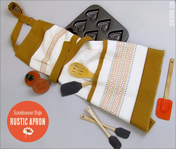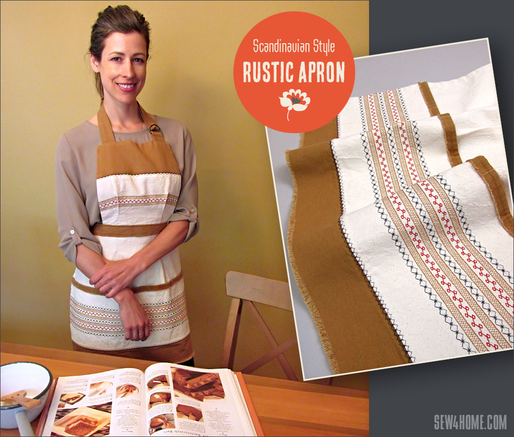 Like whipped cream on a plain piece of pie or a marshmallow dropped in a mug of hot cocoa, decorative stitches can turn an ordinary project into something special. We started with a basic bib and skirt design in two natural colors of cotton duck, then added multiple lines of 9mm decorative stitching. The result: our charmingly rustic Scandinavian apron. It’s perfect to wear while you’re whipping up a little appelkaka (Swedish apple cake) or chockladbullar (Swedish cocoa balls).