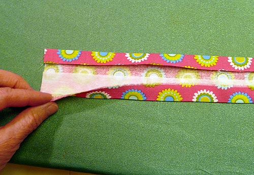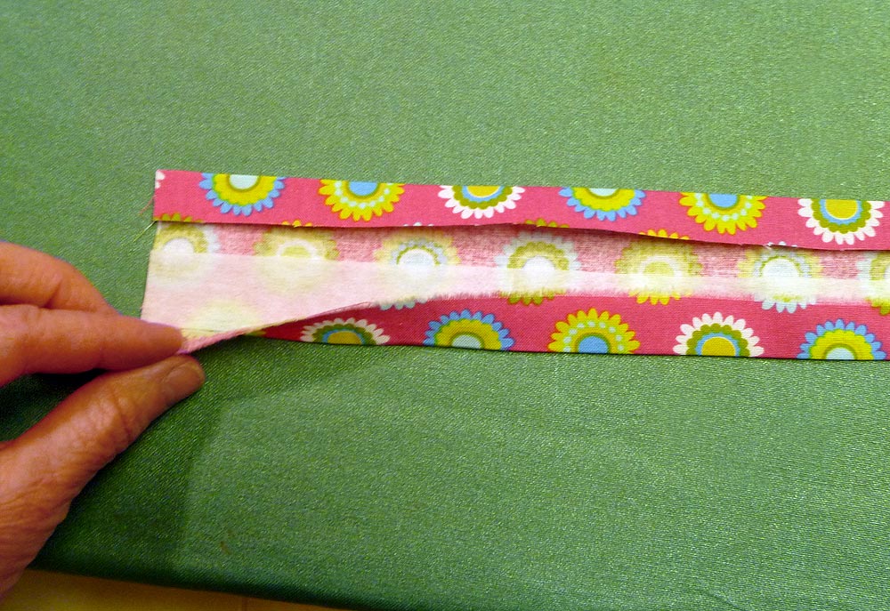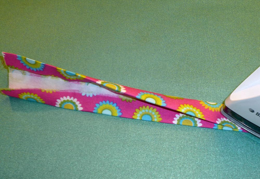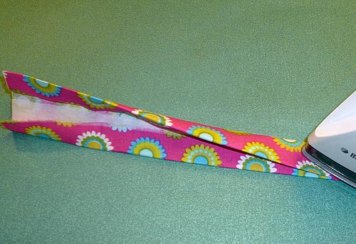 - Tuck an interfacing strip under the folded edge on one side. Following manufacturer’s directions, fuse in place with your iron.