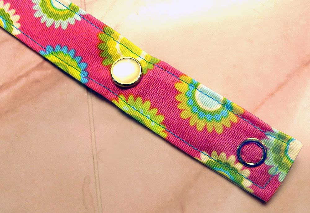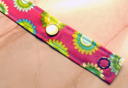 NOTE: We added a folded Sew4Home label at this point, securing it in place with the topstitching. - Apply the ball side of the snap set on the back side of the leash, approximately ⅜” from finished end of leash.