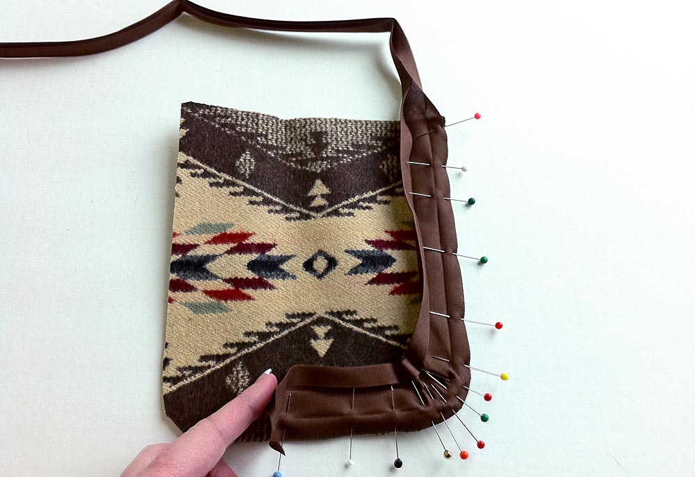 - Pin in place, placing your pins into the fabric but not the binding.