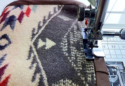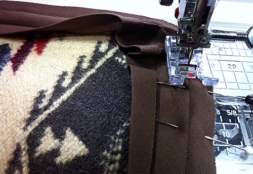 NOTE: We stitched from the top down and around the curve. We had a tiny bit of a challenge starting, because the needle is going through all that thickness at the doubled corners. However, as we’ve mentioned many times before, we love our Janome studio machines because they have such great power and are so good at starting right on the edge. If you are worried about your machine, you could start at the bottom and stitch up. Then you could stitch right off the bound edge at the top, leave your thread tails long, and hand tie them to secure your stitching. Another good trick is to use a hump jumper to level your foot when starting.