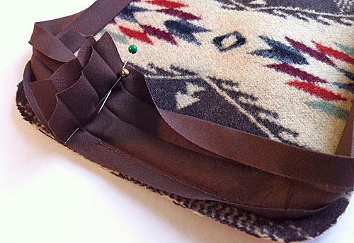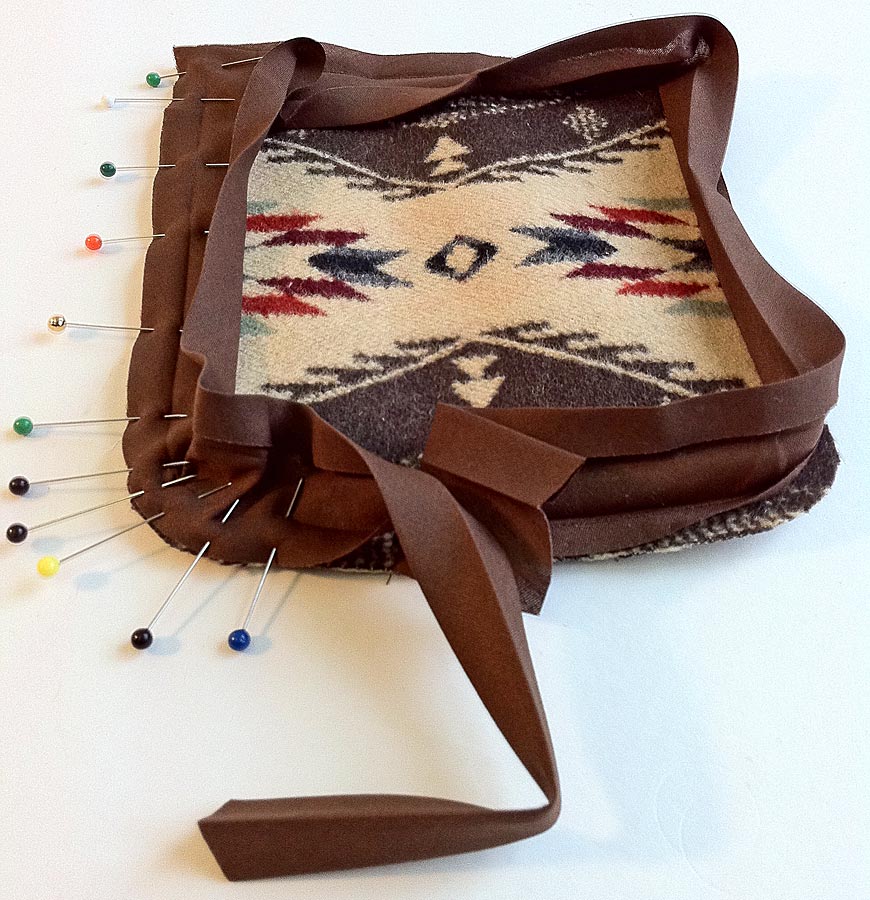 - Start pinning at the center point along the bottom (the curved side). Leave about 2″ loose at the head and start your pinning a bit to the left of the actual center point. This is because you will be folding the piece exactly in half and don’t want the bulk of your bias tape overlap right on that fold.
