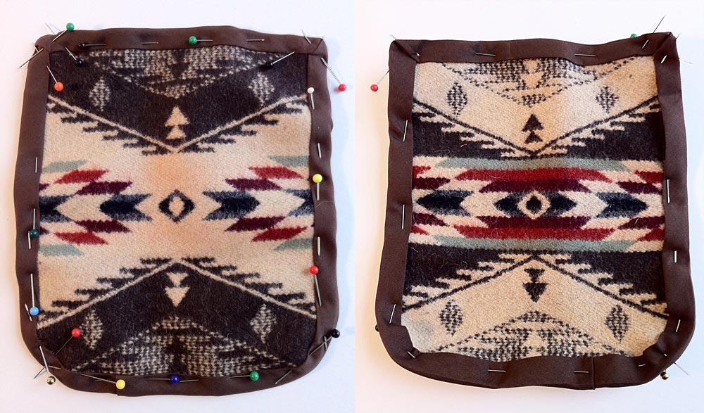 - Press the binding up and away from the fabric and fold it around to the back. The folded edge of the binding should end up just beyond your previous stitching line. Make sure your fold is even all around the edge. The corners should automatically form a nice miter on the front. You may need to futz with them a little bit on the back to get the pleats just right. Pin well. Here’s what ours looked like from the front (left) and the back (right).