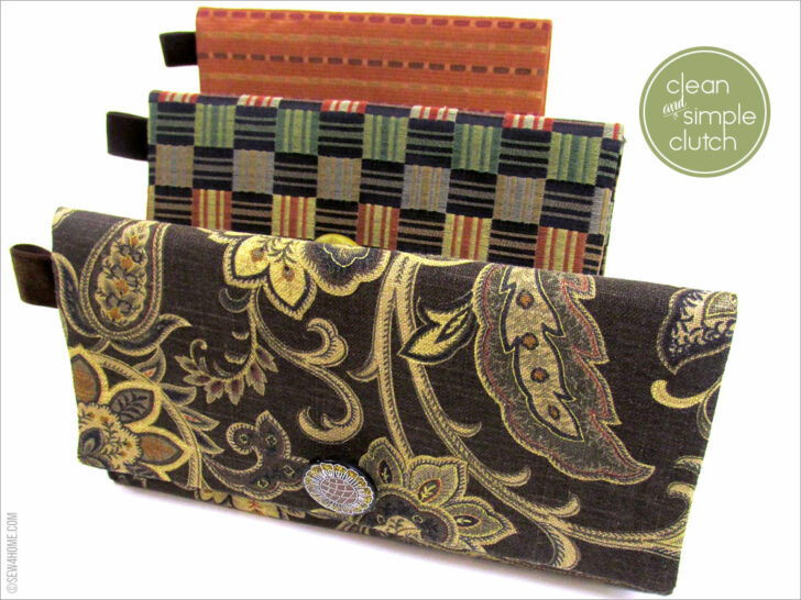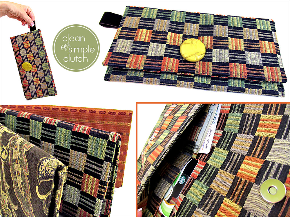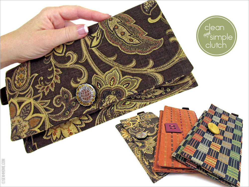 Rather than diving into your own scrap basket, you could also shop the remnant bin in the home décor section at your local fabric store. Home décor fabrics make great remnants because they’re so wonderfully wide. Even a small cut (our remnants were just ½ yard each) will yield a generous cut from which you could make several clutches. Why would you want several? This clutch is a great gift idea!