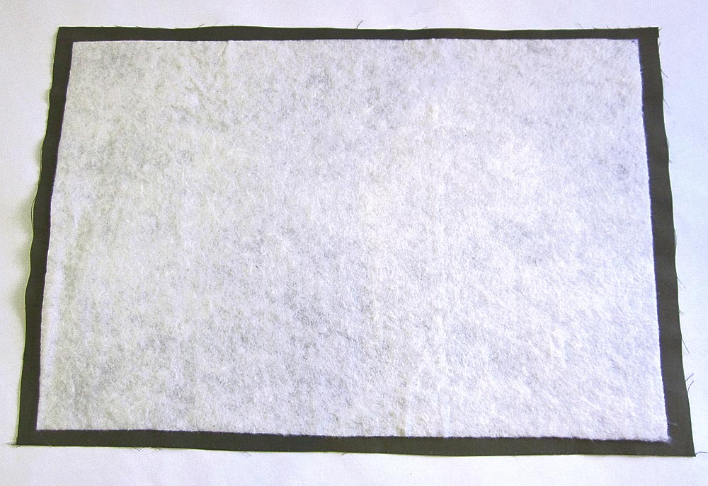 1. Following manufacturer’s instructions, fuse the 10″ x 15″ fleece to the wrong side of the interior 11″ x 16″ rectangle. Center the fleece on the fabric so there is ½” of fabric showing on all four sides.