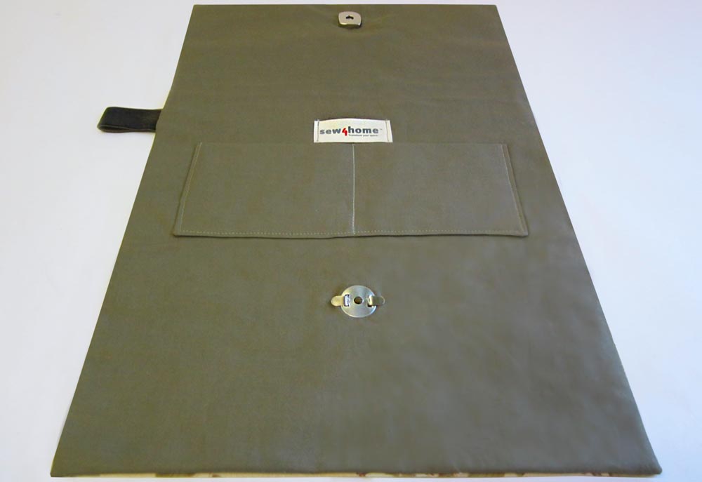 14. Now it’s time to attach the opposite half of the magnetic clasp. Fold the bottom of the clutch up into position. What was the bottom seamed edge should now be folded up so it is in line with the top of the ribbon loop, creating what will be the clutch’s center pouch. The width of the ‘panel’ should be 4¾”.