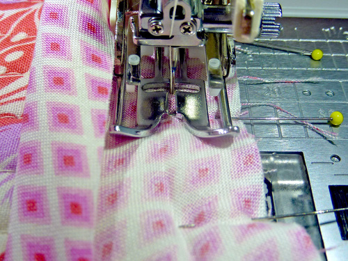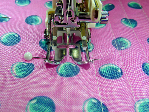 - We used the stripes on one of our selected fabrics as the spacing guide for our straight line quilting. This gave us lines approximately ½” apart. You can do something similar with the motif on your chosen fabric, or you could use a quilting bar to set an even distance, or you can pre-draw lines to follow.