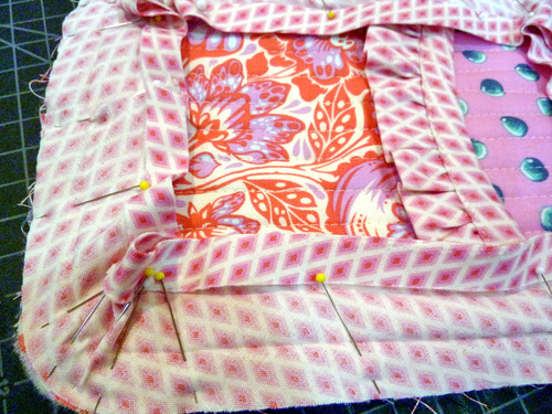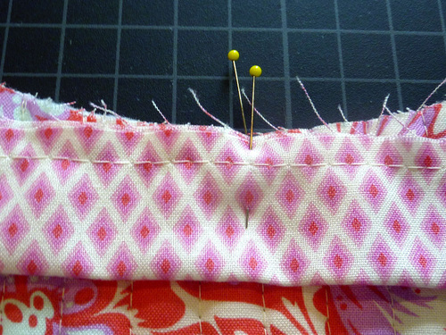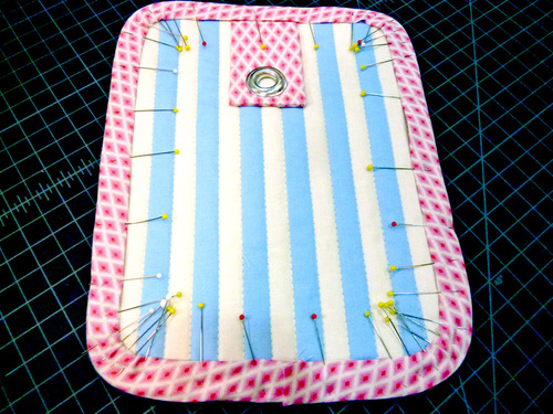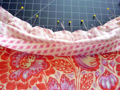 - Find the 8½” length of binding. Open up one side fold and the center fold, leaving the opposite side fold intact. Place this un-folded raw edge along the top curved edge of the pocket, sandwiching the ruffle between the layers. Re-pin through all the layers.