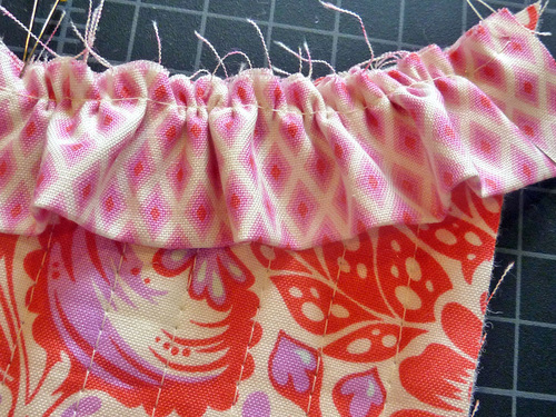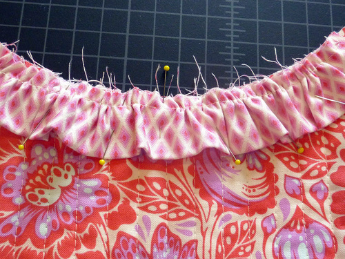 - Pull the basting stitch to gather the ruffle strip to fit the curved top of the pocket. First gather up one side…